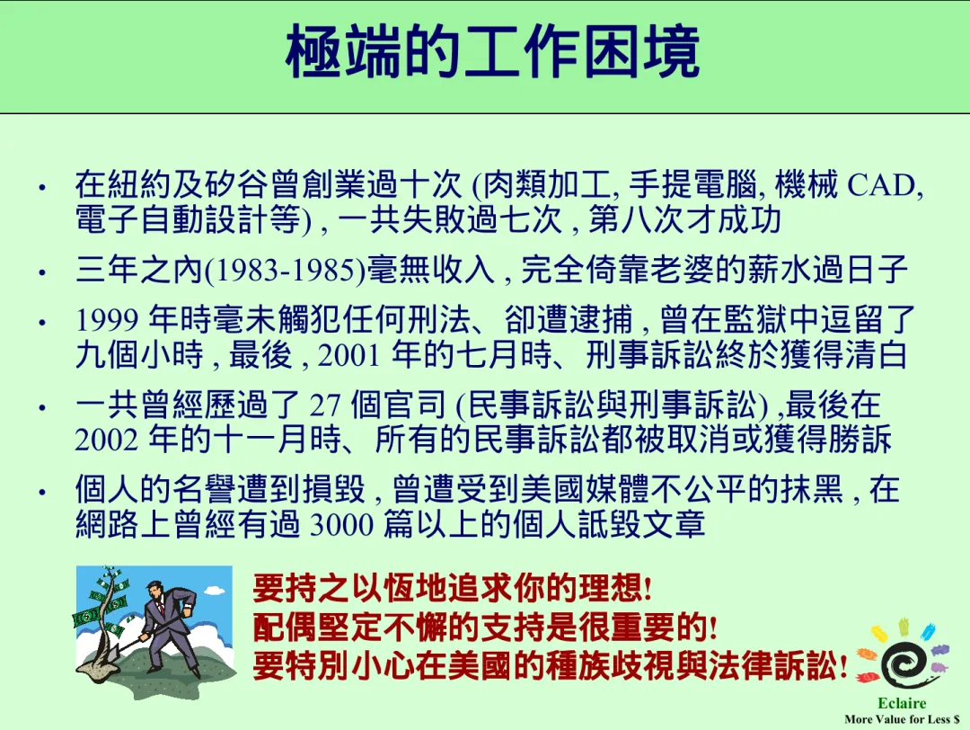 回國后他在大陸開公司。每次做報告時,先介紹自己在 Avant! 的那段傳奇的業績,接著介紹自己的「困境」的時候提到經歷的官司,他本人的 ppt 上是這麼寫的: