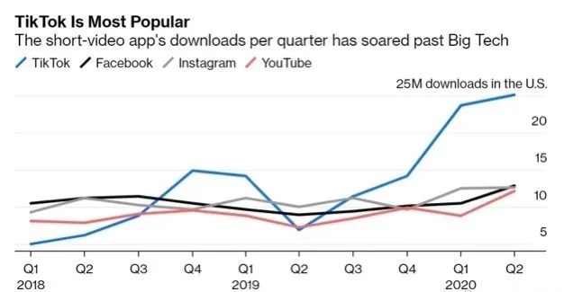 本來位元組跳動是短視頻社交領域的王者,抖音和TikTok是足以挑戰傳統社交巨頭微信、臉書的互聯網新銳力量。這是2020年第一、第二季度TikTok在美國的下載量遠超Facebook、Instagram、YouTube。