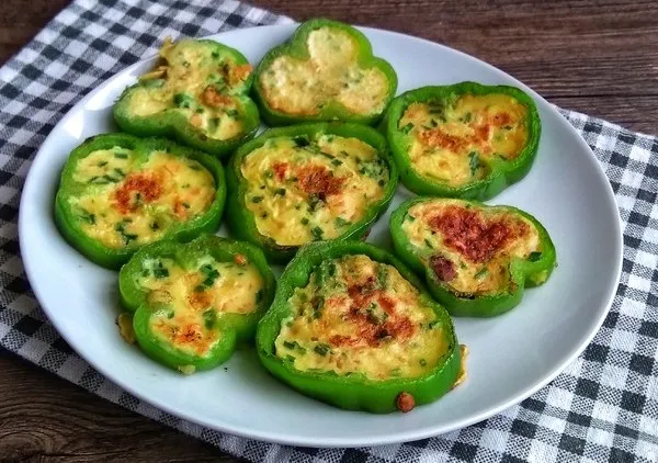 7. 把麵糊用勺子舀入青椒圈裡,用小火加熱煎至兩面金黃,即可出鍋。