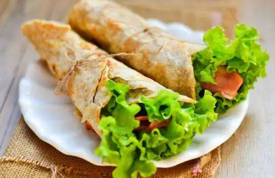 9. 抹一些稀釋的甜麵醬,再加上生菜葉,捲起即可食用。喜歡的也可放香腸或培根一同捲起食用。