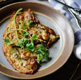 5. 改用中火,直至煎到上下兩面酥脆,呈現金黃色,盛入盤中,伴上香菜葉,搭配魚露即可食用。