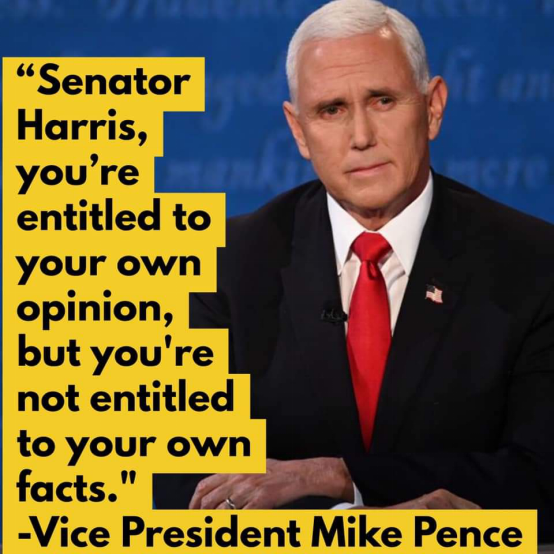 今晚的2020副總統候選人的辯論十分引人注目,現任美國副總統彭斯與民主黨副總統競選人卡馬拉∙哈里斯對陣。彭斯在辯論里表現出堅定睿智,聽起來溫和,擺事實說數字。他對哈里斯說:「你有你自己的見解是你的權利,但篡改事實卻不是你的權利」。反觀哈里斯,嘻皮笑臉、玩世不恭,罔顧事實,謊言連篇,更不敢實質性回答問題,在不少問題上乾脆偷換概念。
