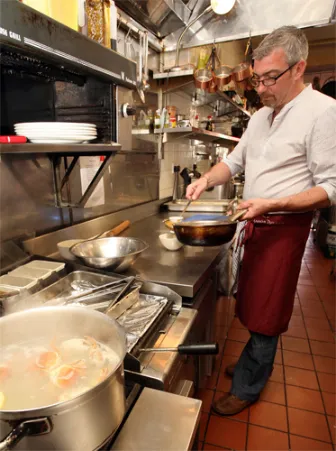 先將整隻大閘蟹放入鍋中,文火燉一個小時,再用擀麵杖將大閘蟹搗碎,並加入洋蔥、大蒜、檸檬汁、芹菜、胡蘿蔔、番茄泥、魚湯以及草藥等配料煮沸,過篩製成一碗蟹湯。