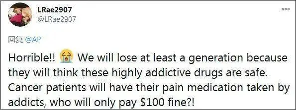 「太糟糕了!我們將失去整整一代人,因為他們會認為這些高成癮性的藥物是安全的。這些癮君子會奪走癌症治療者的止痛藥,而他們只需要付100美元的罰款?!」