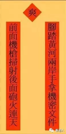 上聯:腳踏黃河兩岸,手拿機密文件;