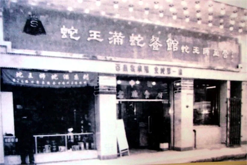 「蛇王滿」為大瀝人梁滿所創,上世紀三十年代在槳欄路開張,賣的是蛇膽、陳皮米酒與三蛇酒,可能也是看中該處藥材生意成行成市。利用取膽製藥后的蛇肉泡製菜肴變成酒家,也是後來的事。我在五十年代后出入「蛇王滿」,除了當街兩個大玻璃櫥窗里爬滿大小蛇類,樓下還保留有出售蛇製品的專櫃,樓上則是餐堂。