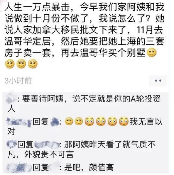 還有一個私企老闆,幾十人規模的小公司,發朋友圈說家裡阿姨突然間跟他請辭。