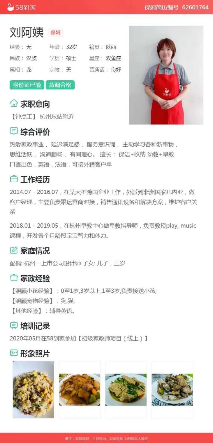 「李阿姨,24歲,本科,住家家教,口語流利,可以直接跟外籍人士溝通,做過外企公司客服和家教……」