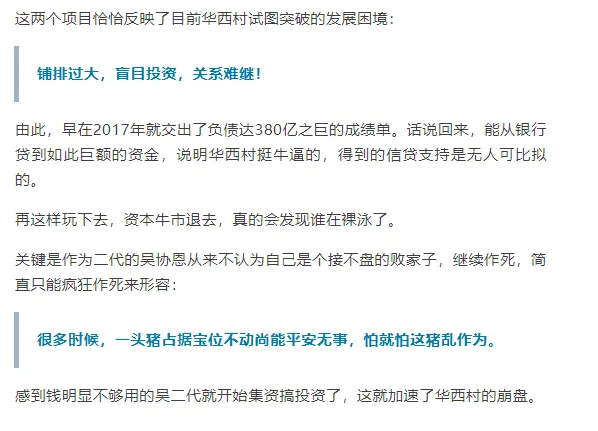 就像華西村掌門人吳協恩說起自己兒子在上海玩電競,攀上了王思聰這一層的關係。這恰恰反映:他是一個嗅覺不夠靈敏的人,他也不想想王思聰背後的王健林和萬達如今又是一種何等的狀況,也與華西村同樣處於一片無邊的寒意之中。
