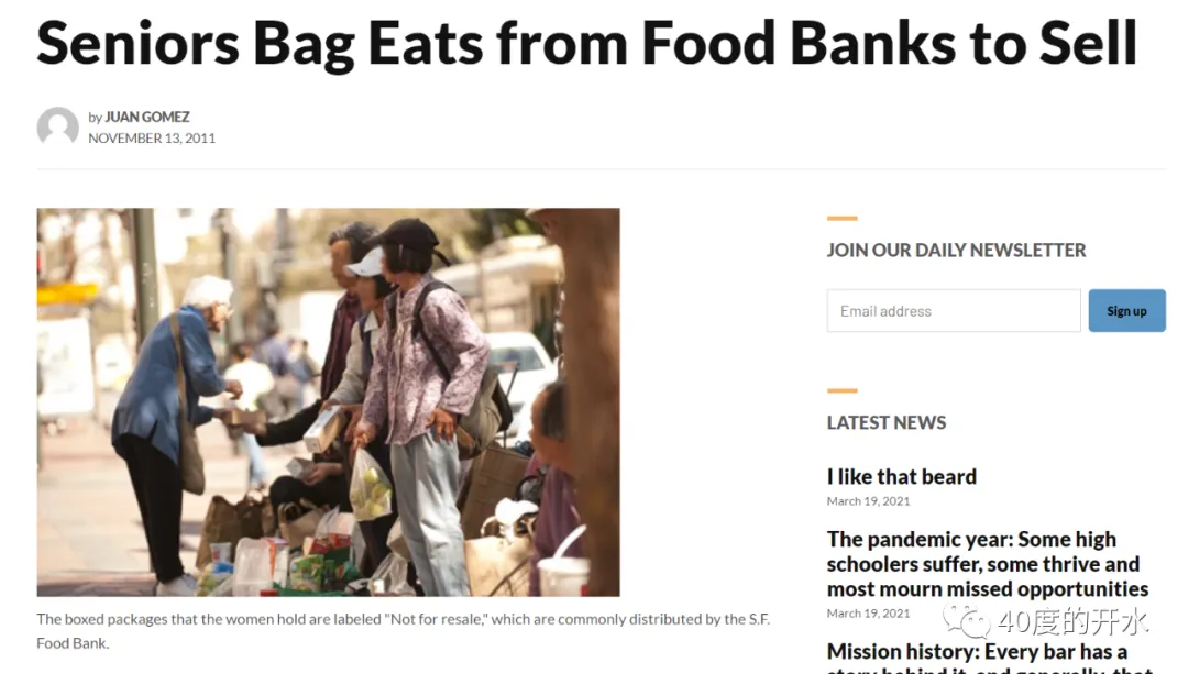 舊金山當地新聞媒體報道了老年人擺攤倒賣免費食物的新聞