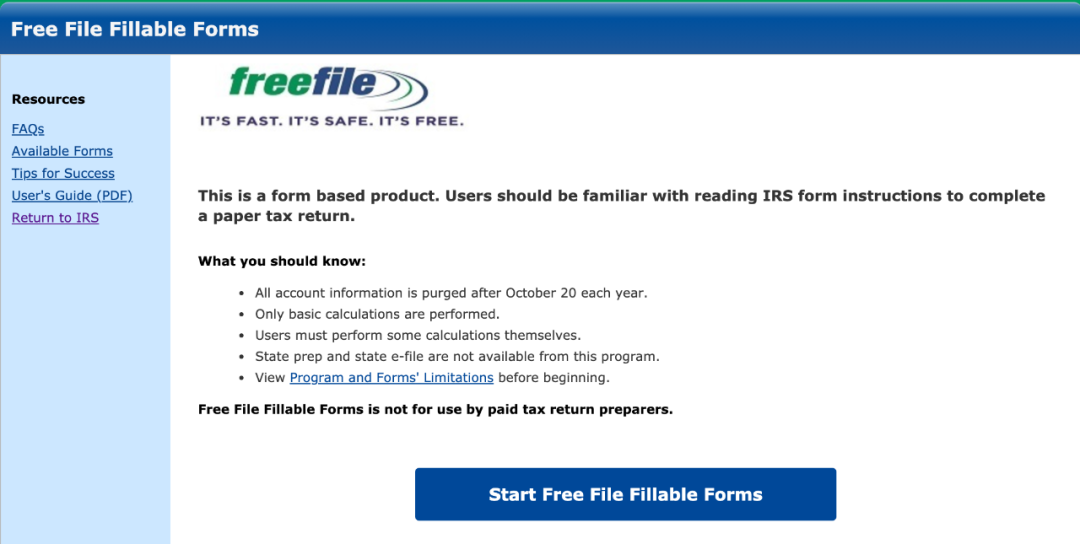 2. Free File Fillable Forms年AGI收入$ 72,000以上,也懂得如何報稅的納稅人/家庭可以用IRS的Free File Fillable Forms"自填式表格"報稅。
