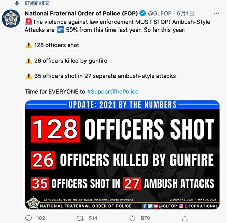 周二,FOP發推文,2021年迄今已有128名警官遭槍擊,其中26名警官在槍火中死亡。在27次伏擊中,有35名警官被槍擊。(取自@GLFOP)