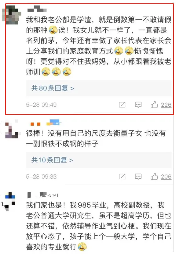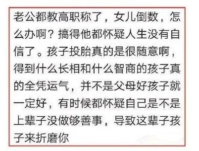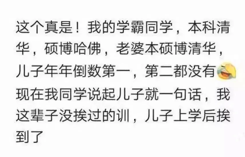 父母都是高智商,對孩子的智商肯定是有好處的。父母都是985以上學歷,孩子考上985的概率為14%,但全社會的平均考取概率只有1%,985父母的孩子強了14倍。雖然你的孩子有9成的概率不如你,但比社會平均考取概率大14倍,這已經足夠證明高智商的優勢了。雖然遺傳稅抽走了一半,但不是還剩一半嘛。當然,在北大教育學博導吐槽自己女兒的新聞下面,一堆人跟風吐槽自己子女的同時,也有與眾不同的清流,比如說下面這種。兩個學渣,楞是生出了一個學霸,平時什麼都不管,學習自動名列前茅。