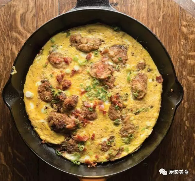 牡蠣和雞蛋的組合,總是鮮美至極。在中國福建,傳統小吃蚵仔煎就是用新鮮的牡蠣,配上雞蛋、少量蔬菜和地瓜粉芡水煎成。但是,美國版的這種牡蠣煎蛋做法不同,是把牡蠣用鹽和胡椒粉腌一會兒,再裹上雞蛋和麵包碎煎熟,然後倒入蛋液小火煎制,最後撒上熟培根碎和香蔥。