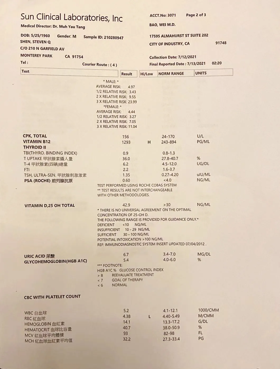 (我和包煒醫生的合照) 這個中文名叫包煒的上海人之所以能夠成為我的家庭醫生,是因為他在16年前幫我治好了痛風。那之前我一直在忍受著痛風的痛苦——雖然在北京不同的大醫院已看診治療過多次,但始終沒能得到有效的控制。以至於我那時每隔幾個月就得痛苦一次——膝蓋腫痛得要命,根本無法下床。 他對我痛風的診斷和治療推翻了幾乎全部國內醫生的醫囑和用藥方式。並徹底控制了我痛風的複發。就是那次他在我心裡「一戰成名」,隨後他也自然地就成為了我固定的家庭醫生。之後他又陸續成為我家上至91歲的老母,下至幾歲兒子全部家庭成員的名符其實的家庭醫生。 等我們熟悉后我才發現我的家庭醫生可不簡單。他曾數次當選全美評選的年度「百佳醫師」,同時他也是2008年北京奧運會美國奧運代表團的隨隊醫生。特別是在治療痛風和乙肝這兩項疾病上,他都能排入美國最頂級的專家之列。 這次看診我如約而來,一見面他就問我體檢結果出來後為什麼不來複查。我說:我體檢后沒有像以前那樣接到你們診所的電話,就以為全部指標都正常,所以我就沒想這個事兒。 他笑了,翻開手中的檔案告訴我:「我們是7月23號下午兩點半給你打的電話。也就是說在體檢結果出來后的三天之內,但是你沒有接電話,而且你的手機也不能留言。」 確實,我想起來這次要不是我老婆主動打電話到診所來,還不會發現我體檢有指標不正常而需要看診。恐怕這就是一個和國內醫生的不同之處。我在國內也看病幾十年。從來沒有經歷過這種事——一個醫生主動給你打電話告訴你需要看病了。這就是美國家庭醫生的一個特別之處——他會主動聯繫你叫你去看診。 翻開他這次剛給我的體檢報告,在那密密麻麻的幾十項結果中,我看到維生素B12一項大大超過正常指標。