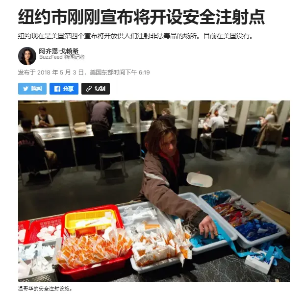 為了討好吸毒的選民,紐約市開設了毒品安全注射點,政府免費發放不要錢的一次性注射器,讓選民們可以更安全的給自己注射毒品。
