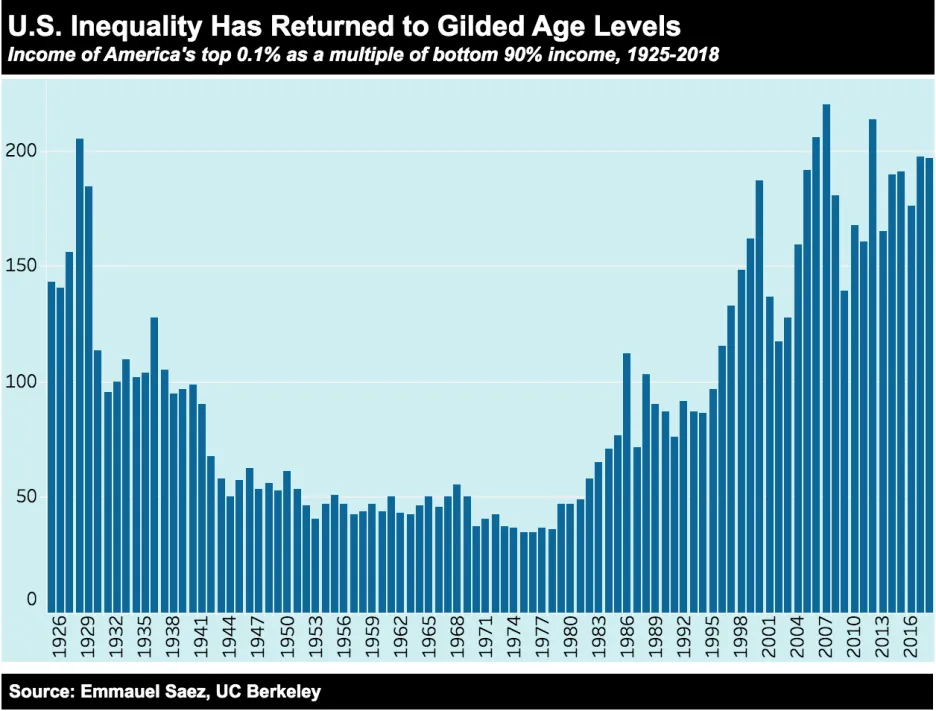 下圖給出的是1925-2018年期間美國頂部0.1%富人收入與底部90%的人的收入相比的倍數。圖表的標題觸目驚心:美國的貧富差距程度已經恢復到鍍金時代的水平。