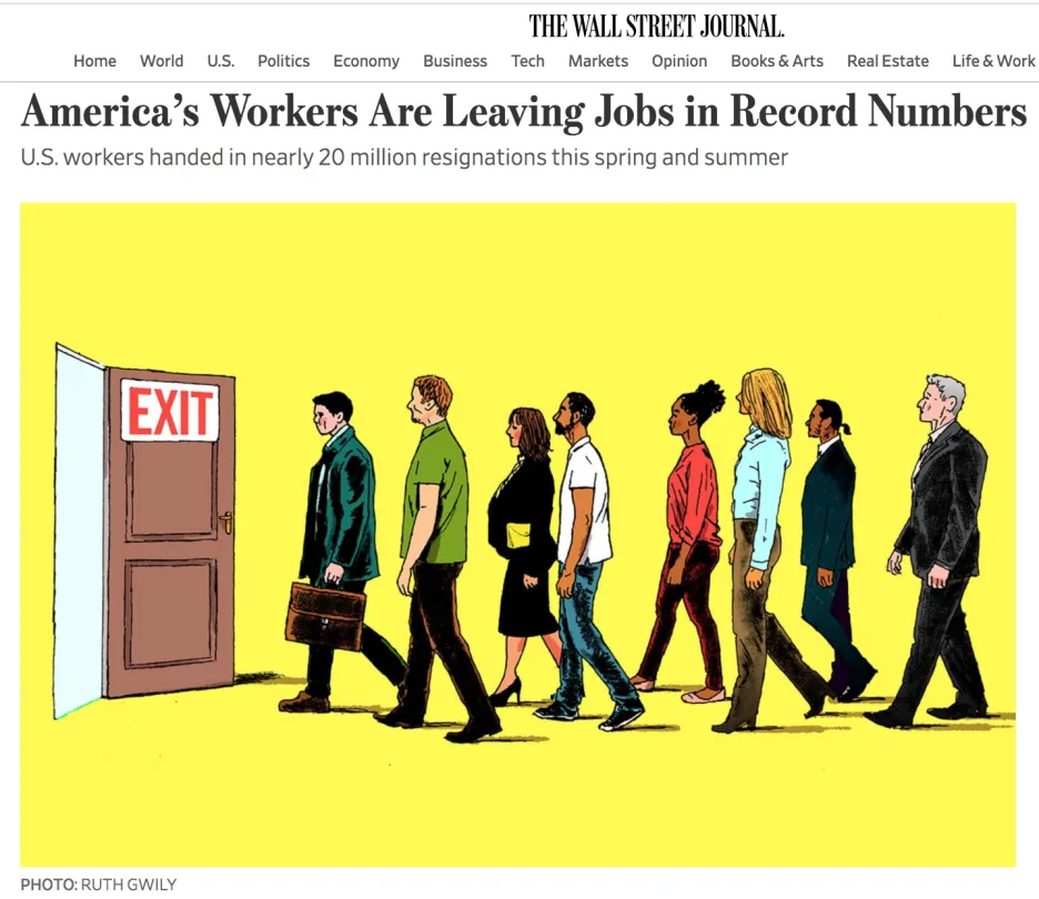 《華爾街日報》報道說美國工人正以破紀錄的人次辭職。(《華爾街日報》截屏。)