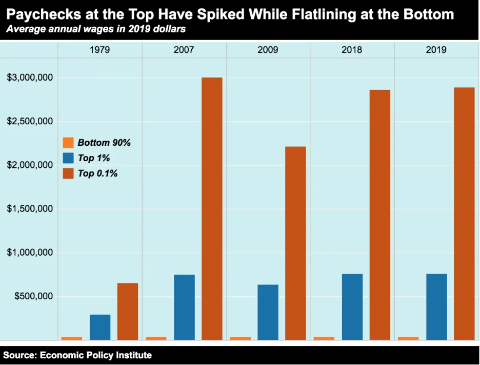 此圖的標題是:當底層收入不變時,頂層收入飆升。圖中三個顏色分別代表底部90%,頂部1%和頂部0.1%的人在不同年代的平均收入。