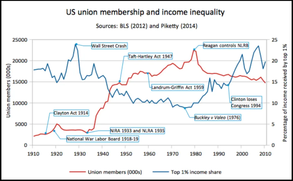 上圖是從1910-2010年工會成員佔比變化與最富有的頂部1%的人收入佔比變化的趨勢比較。可以看出,隨著工會力量的衰減,貧富差距越來越走向極端。