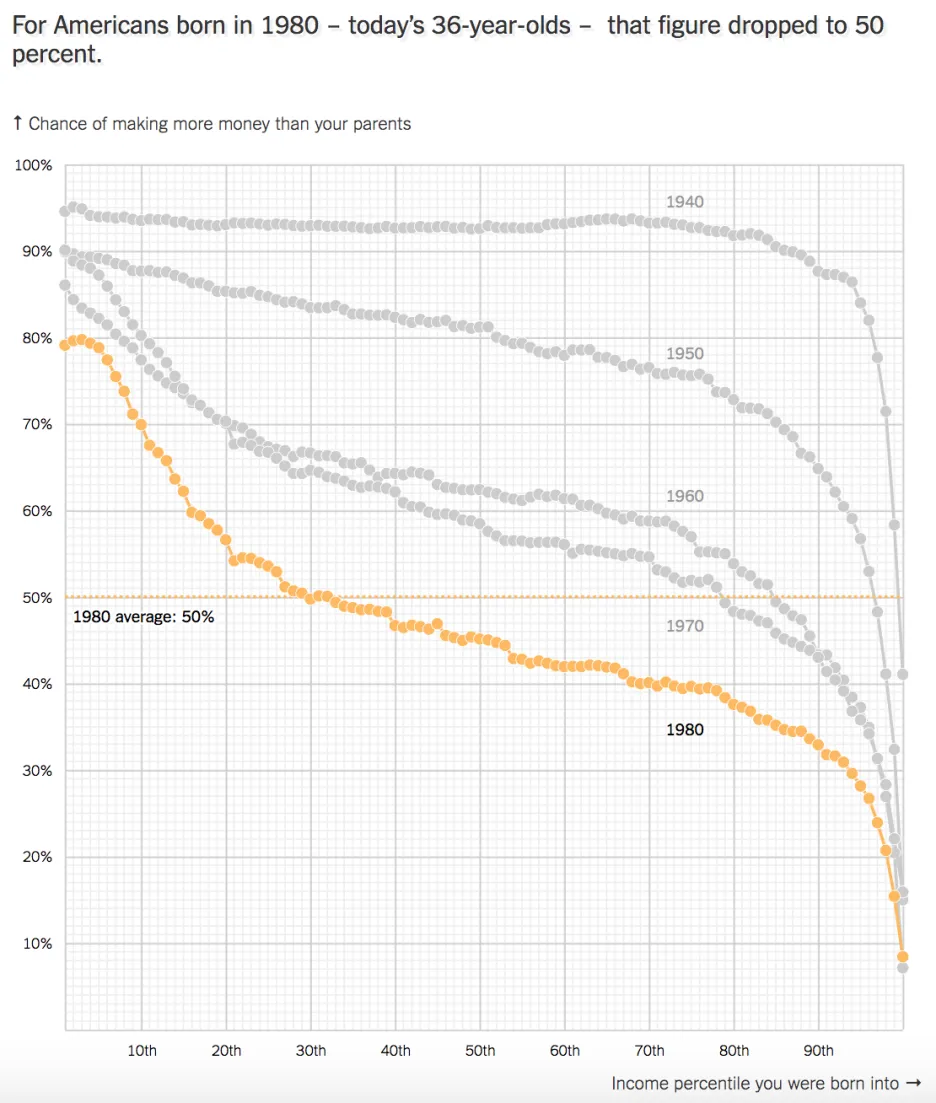 從圖中可以看出,出生於1940年的有92%的人30歲時比父輩30歲時的收入高。出生於1940之後的人,這個幾率逐漸降低。到1980年出生的人,只有一半的人能比過父輩了。