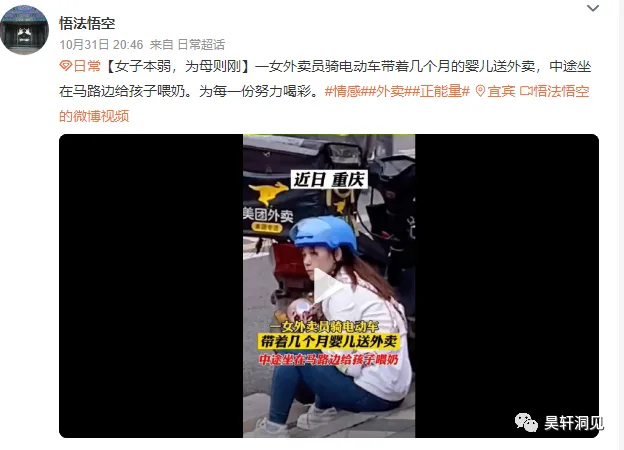 前陣子我在網路上看到一張圖片,一位女性外賣員,在送外賣的間歇給孩子餵奶。居然有人認為這張圖片體現了所謂的正能量。我真的是大跌眼鏡。什麼樣的人,能把底層的苦難當成是正能量?是不是腦瓜子有些秀逗了?