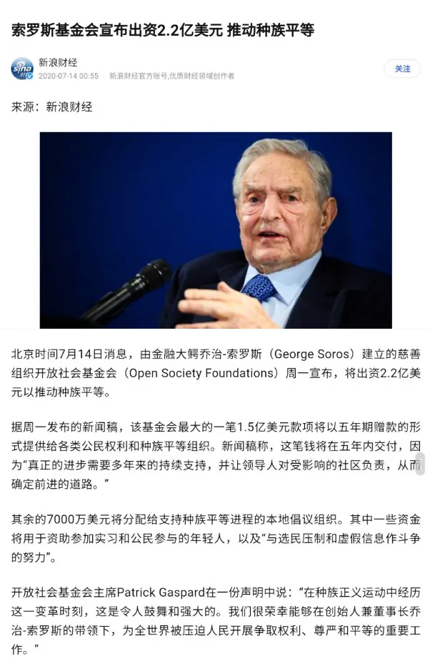 就是那個著名的金融大鱷索羅斯,他旗下的開放社會基金會,在2020年7月14日這一天,宣布提供2.2億美元,致力於推動種族平等。