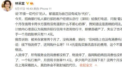 從收支角度講,封控兩個多月,大部分人的存款是增加的,因為相比收入,個人支出是銳減。著名經濟學家林采宜,封控期間一個月的信用卡賬單隻有11.4元,驚動了招商銀行:客戶出什麼大事了?