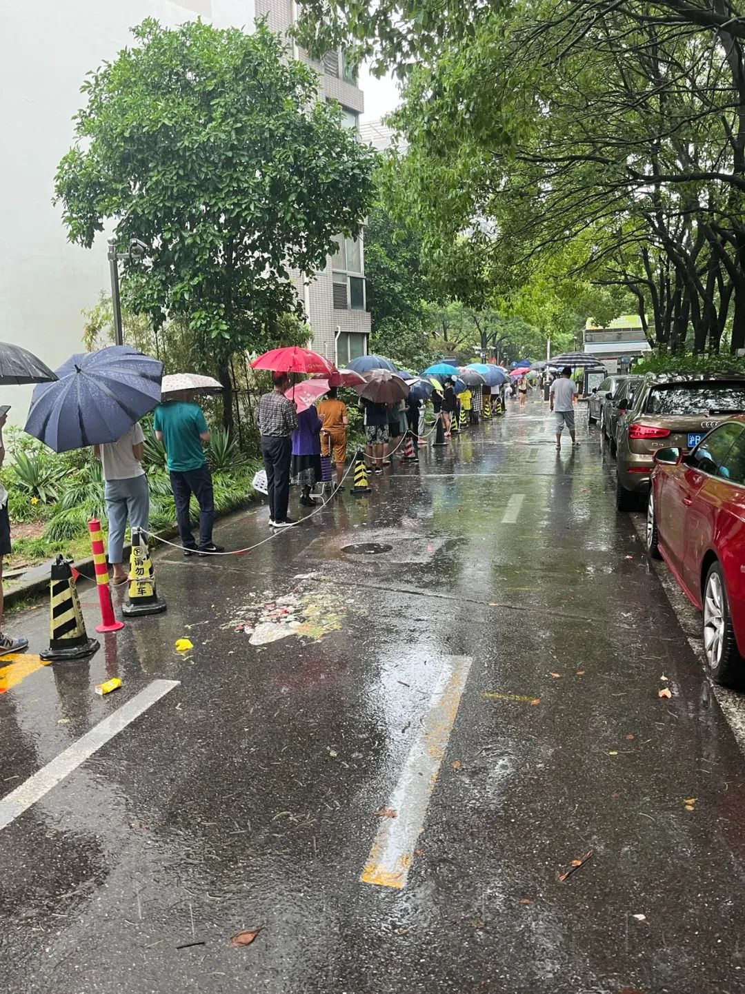 端午假期的最後一天,大雨,為了第二天的上班,大家打著雨傘排隊做核酸。