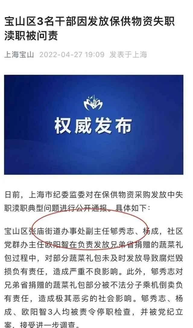 4月27日,上海市寶山區張廟街道辦事處副主任郇秀志,在發放保供物資中存在瀆職行為,致使居民收到腐爛物質,因此被停職調查和黨紀立案。