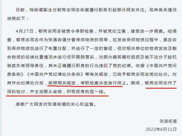 6月11日,寶山區張廟街道對此作出回應:郇秀志同志作了深刻檢討,停職調查自行終止。