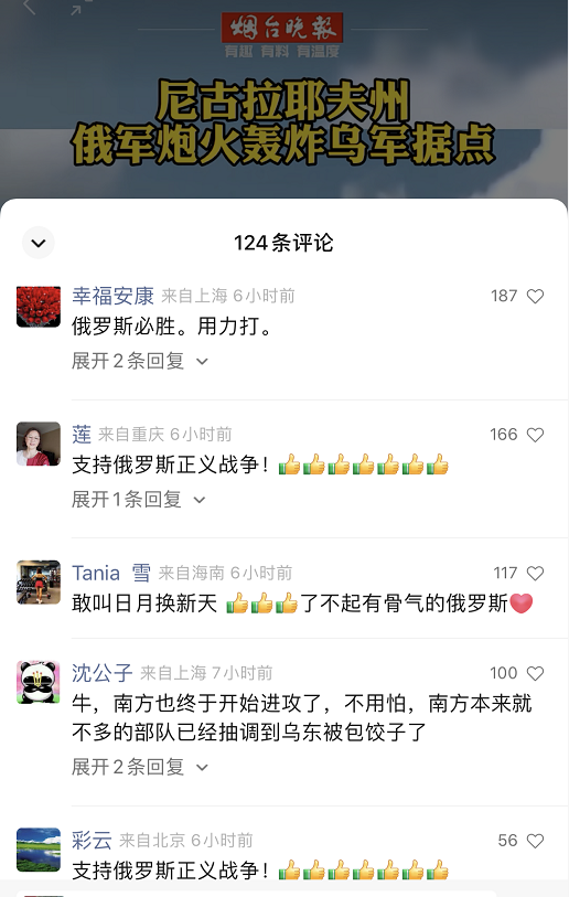 但是,5月30日,烏克蘭尼古拉耶夫州,俄軍炮火轟炸烏軍據點。看了下面烏泱泱的中國人的評論,我無語了,是什麼原因讓他們如此支持俄羅斯攻打烏克蘭?又是什麼原因,讓他們相信俄羅斯攻打一個主權國家是正義的?