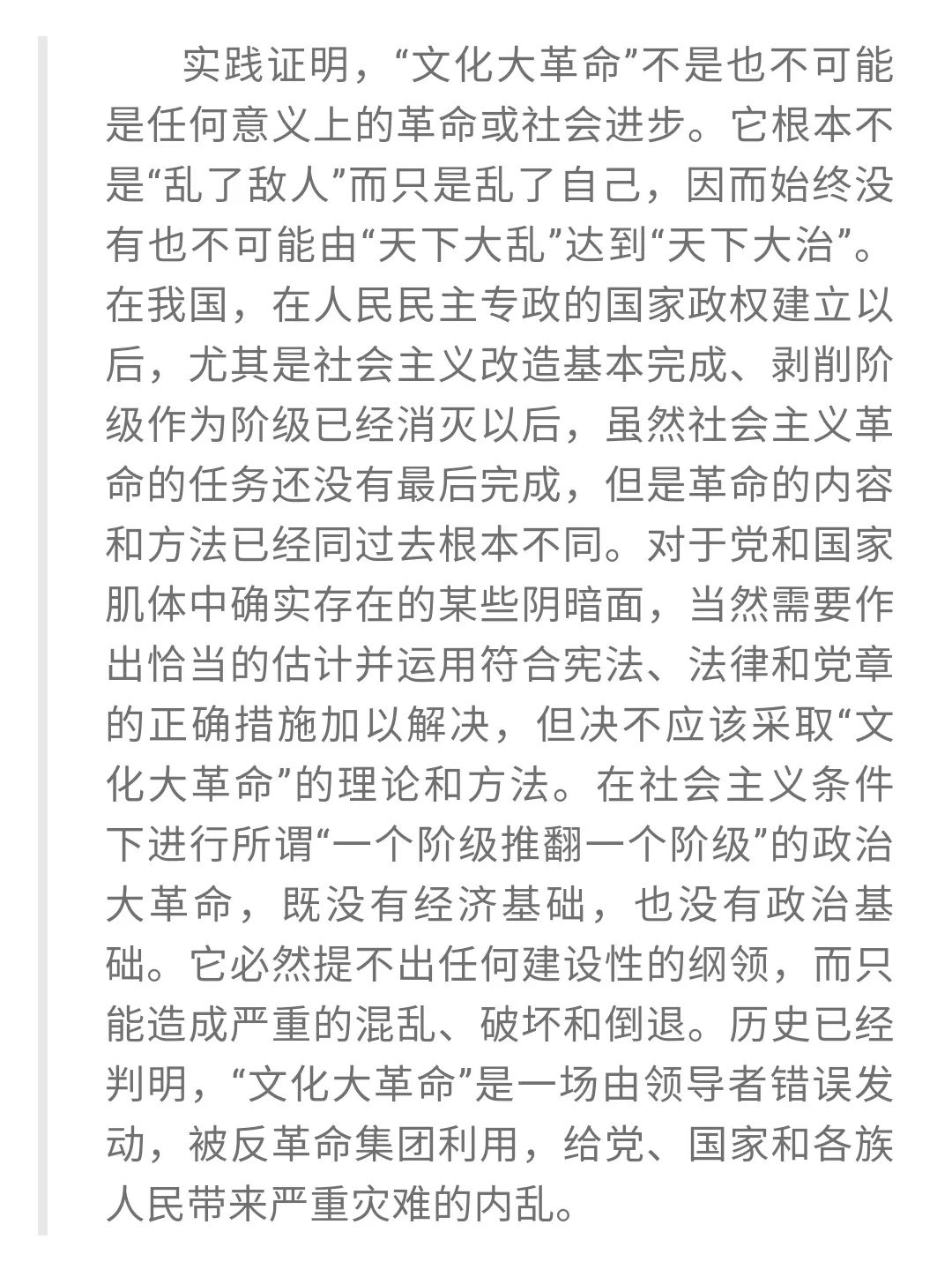 由過去的「艱難探索」改變為:「實踐證明,『文化大革命』不是任何意義上的革命或社會進步,而是一場由領導者錯誤發動,被反革命集團利用,給黨、國家和各族人民帶來嚴重災難的內亂」。
