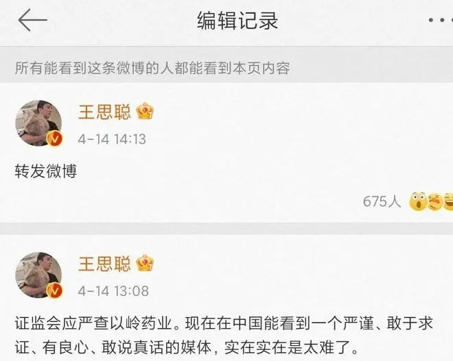 有了資本對輿論也能掌控,比如4月14日,王思聰轉發了「@睡前消息編輯部」的質疑連花清瘟的視頻(建議觀看),並留言:「證監會應嚴查以嶺葯業」。
