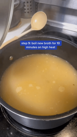 小火咕嘟嘟,差不多45分鐘以後,過濾下就得到了高湯一鍋。看這金黃的色澤,油脂融合均勻,自帶風味。