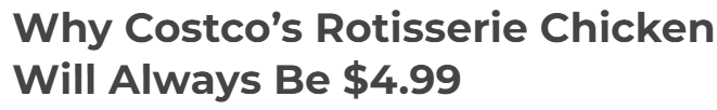 不過,在這一年,以及過去的11年時間裡,有一隻雞的價格始終保持不變,那就是Costco $4.99的烤雞。