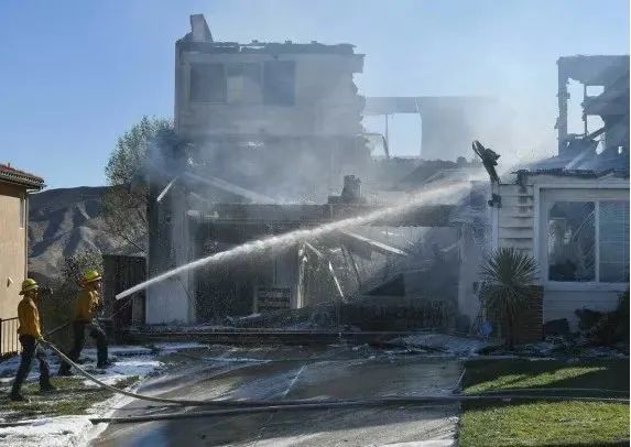 圖中為2019年10月,在加州聖塔克拉里塔附近的阿瓜杜爾塞,消防隊員在住宅火災期間用軟管沖洗燃燒的房屋。圖片來源於npr.org。