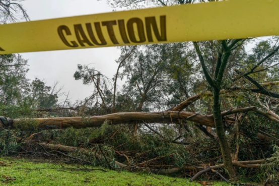 圖中為2023年3月10日,在洛杉磯的Elysian公園,一條警示帶圍繞著一棵倒下的桉樹,而乾枯的樹木是火災中很好「燃料」。圖片來源於accweather.com。