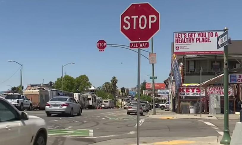 (圖片來源:https://www.dailymail.co.uk/news/article-13437063/Oakland-California-homeless-stop-sign-traffic-light.html)