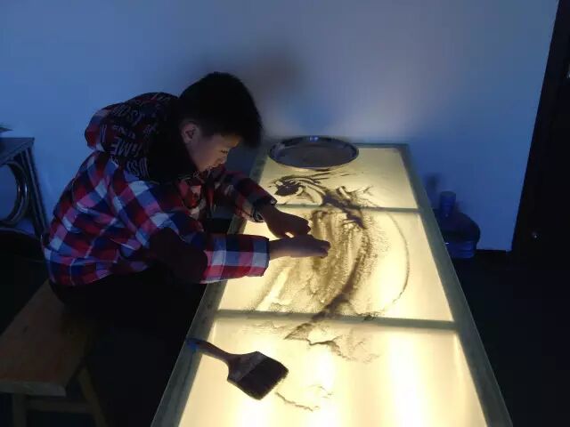進屋體驗沙畫,我打開電腦,讓他自己搜索沙畫教程的視頻,看了一集,自己到沙箱前試著畫去了,好一會兒,等我把飯端到飯廳時,他抖沙,造型,已經很成熟了。