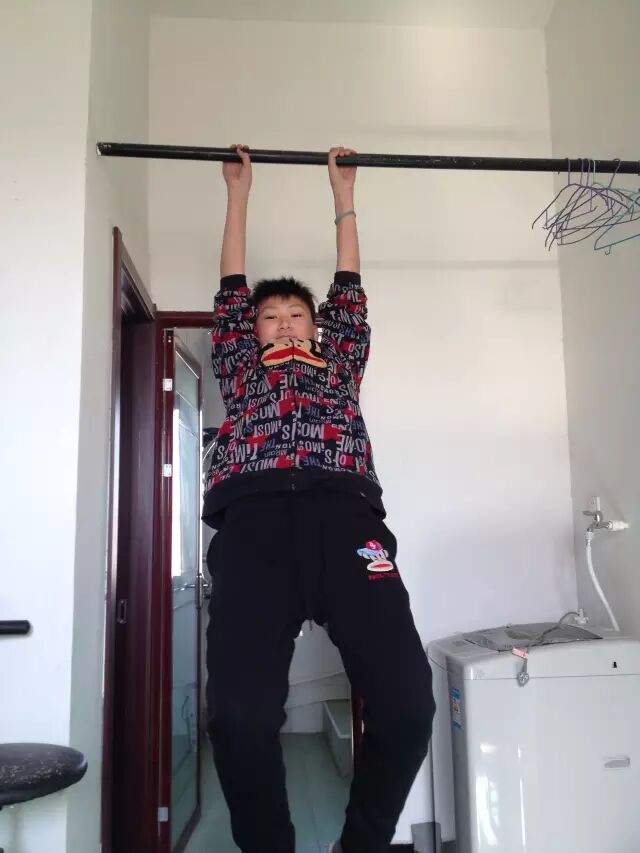 這是教室門前2.2米高的單杠,我告訴他,我身高雖然才1.65米,但由策身高是1.85米,就是每天臨睡前在單杠上伸一伸,,,顯然在學校很少有這樣跳高的機會,但他還是鼓足勇氣試了一遍又一遍,終於抓住了。