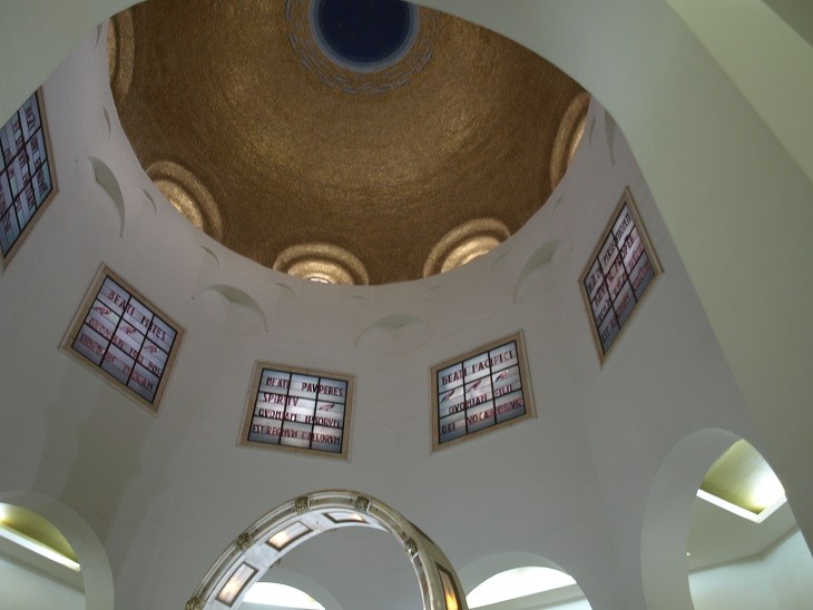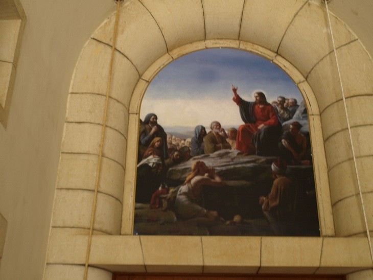 這典故出自馬太福音,至少馬太福音。故事大致為,主耶穌一路走一路講,來到一處小山,大家坐定,耶穌講了著名的八福。