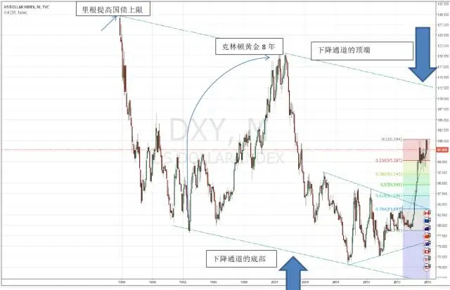從美元的角度看,美元指數(見圖3)處在一個歷史性下降通道中(藍色箭頭)。1985年12月12日里根總統宣布美國的國債上限上調到2兆美元並一直維繫到1991年。美元從頂點應聲而落並持續了約8年的衰落,直到1993年2月17日柯林頓總統上台宣布新經濟計劃削減4960億的美國赤字,刺激經濟使美國找到了新的經濟增長點-互聯網高科技。美元又重拾升勢氣勢如虹直到8年柯林頓總統期滿。縱然醜聞在身,但數字證明柯林頓是奇才,美國人民的好同志。目前這波美元的中期上升開始於2008年3月。在2014年9月份正式突破三角形的整理而上升到目前的100左右。根據圖表中歷史性下降通道頂端位置(見藍色向下箭頭),美元至少會有12點的上升空間至112的位置。時間或3至5年或更長。