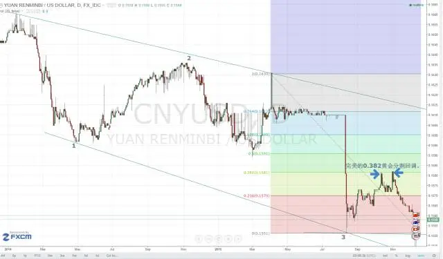 由於基本面分析不在本文討論(網上和微信上已泛濫,大家可自行瀏覽),所以以技術分析角度看,在下降趨勢中,反彈至0.382的黃金比例點而在此下跌超過上個低點(見3 - 即 6.45元人民幣)1.2 倍的機會大概超過70%以上。因此,下一個低點可低至約1美元兌7.74元人民幣左右(假設單純技術層面考慮而其他因素未計入)。