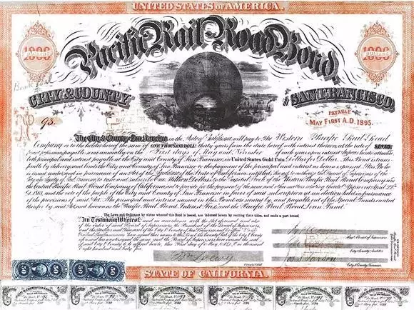 市政債券歷史可追溯至早期文藝復興時期的義大利市政當局向當時的幾大銀行家族之間的融資拆借。美國的市政債券最早開始於1800年。有記錄的是1812年,紐約市政府用於修建運河發行的普通責任債券。隨後的幾十年,眾多美國的城市都舉債用於城市發展建設和增加公共教育系統。下圖為1895年舊金山市發行面值為$1000的市政債券。那一年中日甲午戰爭剛結束,中國忙於賠款,外國資本剛開始湧入。