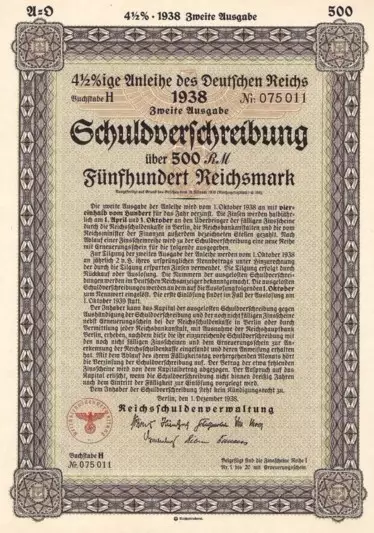美國南北戰爭期間,地方政府發行大量債券用於修建新興的鐵路,連當時最大的投資銀行也是由北方太平洋鐵路投資,後來由於倒閉,連帶眾多公司倒債,甚至引起股市震蕩,從而停頓了市政債券市場的發展。後來各州政府嚴格規範了地方債發行市場,並訂立規則。市政債券伴隨蓬勃向上的經濟一路來到1930年的大蕭條而再次消沉,但隨後的第二次世界大戰,在全民資源轉為軍用參戰的背景下再次讓市政債券成長。下圖為1938年二戰納粹德國發行的戰爭債。