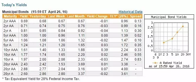 在美國這個崇尚收稅的國家裡,免稅讓人眼睛一亮。可仔細看下錶(2016平均市政債券收益),好像收益不是很高,比如最優信用AAA級別的市政債券2年期年收益只有0.69%,稍低評級A的也只有0.81%。20年期稍高,可也是2.6%。沒辦法,在這個低利率,甚至負利率的年代里,這種固定收益的,又是免稅的,實屬不易了。