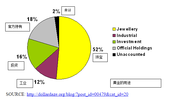 從供給與需求的角度看(見下圖),全世界超過一半(52%)的黃金被用來製作了首飾,黃金工業用途上只有12%,用來投資保值的是16%,政府持有作為儲備只佔18%。可見黃金在實際用途上需求不大,它的價值更多是基於人們心理上的預期與期待。這種不是建立在實際價值,例如現金流(Cashflow),產出(production)