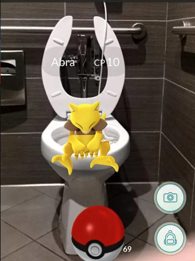 當有人在廁所拿出手機準備開拍時,一定要淡定。雖然美國美國廁所已經男女或非男非女混用了,但他/她對你不感興趣,他們感興趣的是Pikachu。What the hell ……..? 廁所里明明只有一個人。沒錯,但這個叫Abra的傢伙是Pokémon Go手機遊戲里的小精靈。