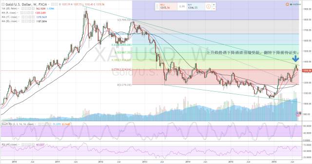 市場太多不確定性導致避險資產的大幅攀升。黃金作為其中的重要選項2016年至今已攀升25%。在退歐的影響下,一度達到2014年的高點$1374。如上篇分析文章《現在押注黃金不好玩》(點擊閱讀)所述,黃金在觸及多重阻力區(Fibonacciretracement 38.2%)1400美元左右後,現做向下調整,只是目前向上的形態沒有被破壞,是否變成向下的趨勢翻轉尚待進一步確認。目前美國消費者指數(CPI)是1.6. 距離美聯儲緊盯的指標2還有段距離。但核心消費者指數Core CPI (不含食物和能源)已從5月的2.2增至2.3. 配合不錯的非農就業報告,可能又讓美聯儲看到了加息的微弱小光。黃金對利息變化敏感,通常和美元反向而為,加息會使美元強勢從而弱化金價。美聯儲的利率政策也許會證實目前金價只是技術性回調還是下跌的趨勢翻轉。黃金5年來起伏跌宕的走勢證明,黃金作為避險資產,其本身就是風險投資。